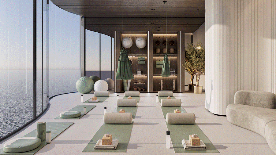 The wellness elements reflect this same approach. Cryotherapy and hydrotherapy sit alongside yoga and Pilates pavilions, meditation decks, and landscaped paths. These features are arranged to encourage repetition and routine, supporting the idea that small daily practices shape long-term wellbeing. Dining programs will emphasize nutrient-rich and sustainably sourced ingredients, reflecting a growing shift toward food that contributes to clarity and balance.