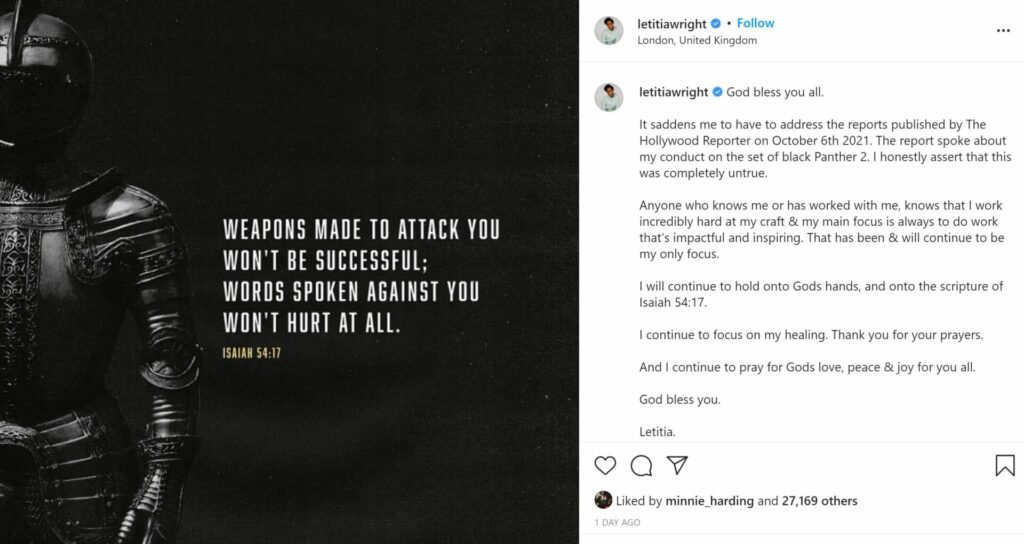 She wrote on Instagram: “It saddens me to have to address the reports published by The Hollywood Reporter on 6 October 2021.