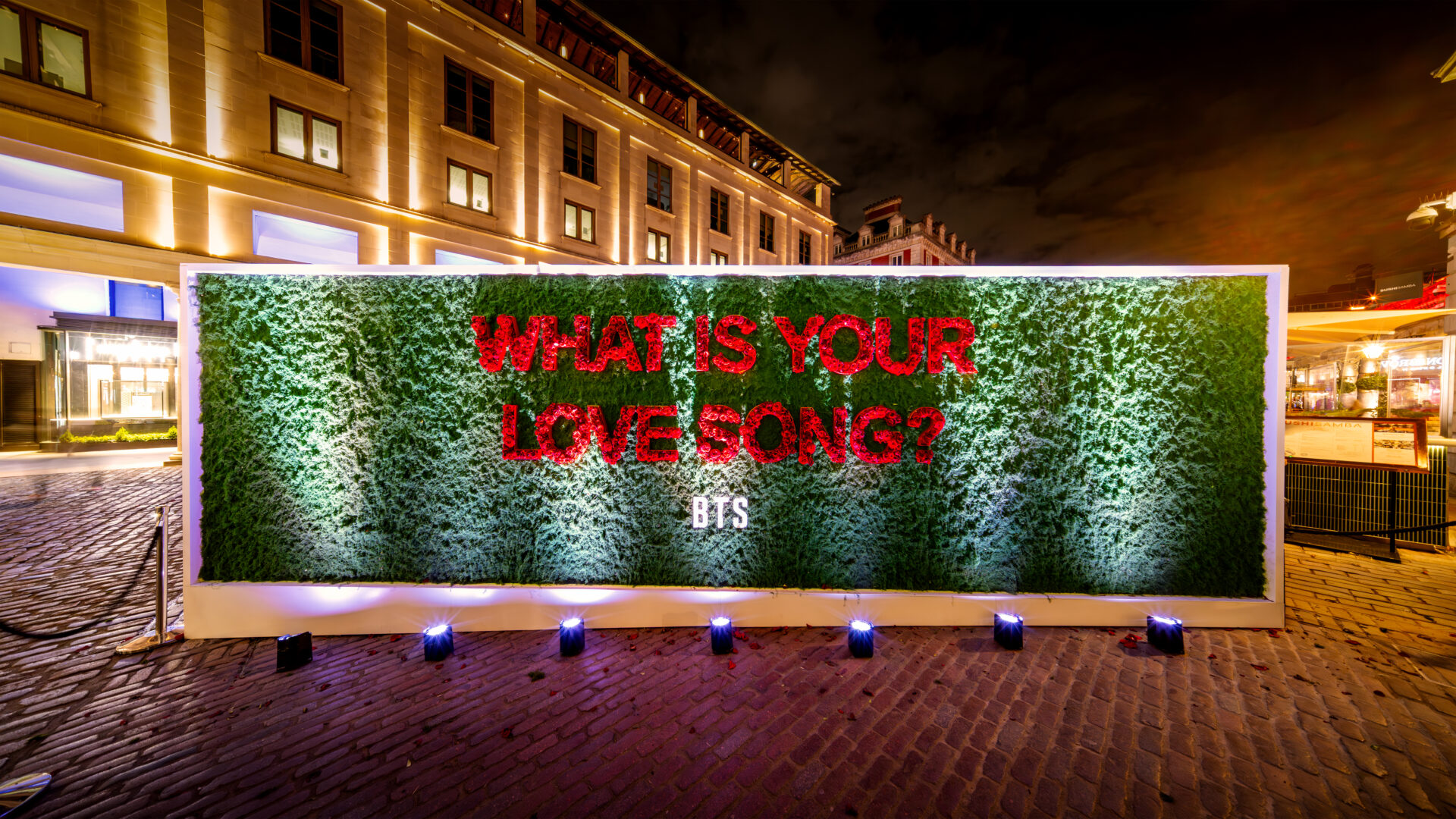 On the fourteenth of the month, an art wall, filled with red roses, appeared in Covent Garden, where fans were invited to pluck a flower from the wall, which once again revealed the phrase “WHAT IS YOUR LOVE SONG?” this time with the BTS logo underneath.