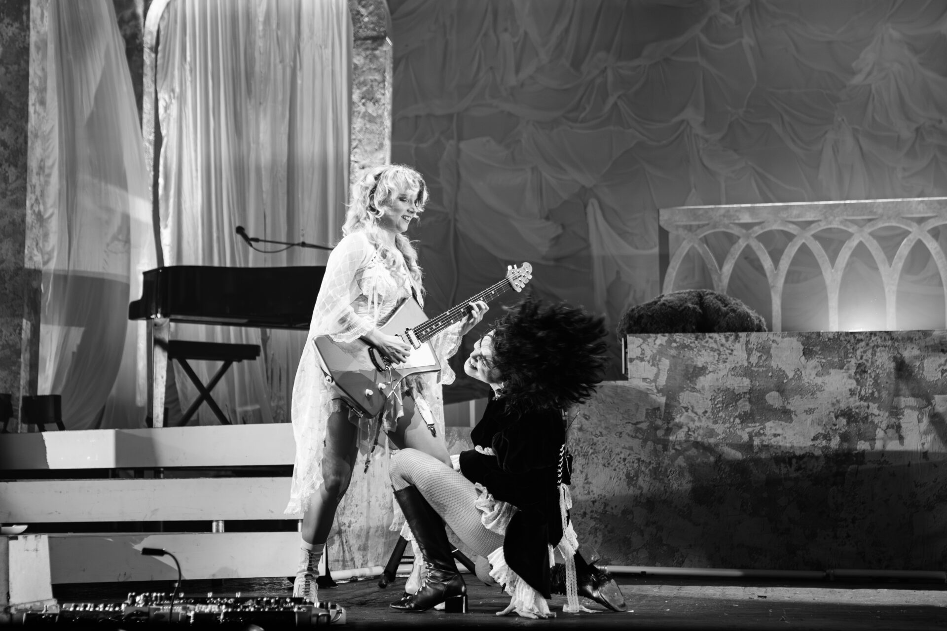 Opening with the soaring pomp of ‘Agnus Dei’, it’s a performance which leans into extravagant and dramatic moments, but one which also shows off a more emotional side. That’s in part down to the showmanship of Morris, who is equally comfortable zipping across stage – see first album standout ‘The Feminine Urge’ – as she is showing off vulnerability. That latter point is particularly true when they launch into ‘The Scythe’ – a rock sound about facing mortality which, ironically, sounds absolutely joyous.
