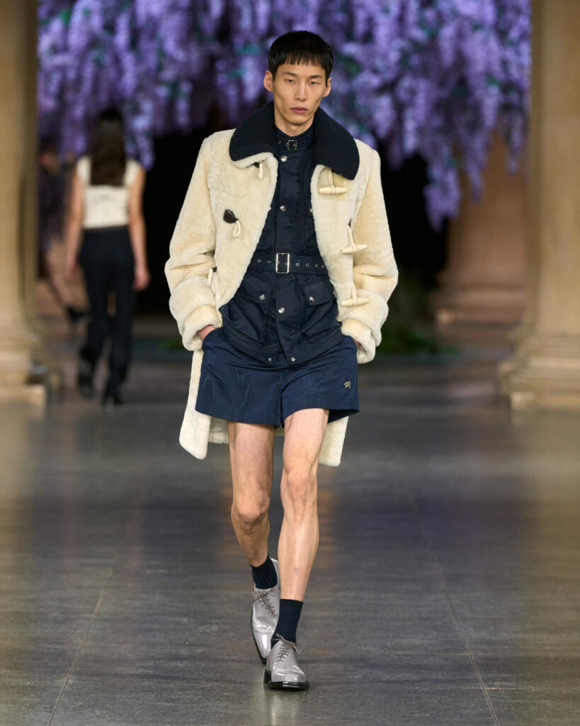 When the models began their promenade you could feel Fletcher wrestling with Britishness this season. The designer’s repertoire of the nation’s tried and true sartorial codes were present; tailoring and trench coats, field jackets and duffels. Still, this season that DNA was injected with an unexpected severity.