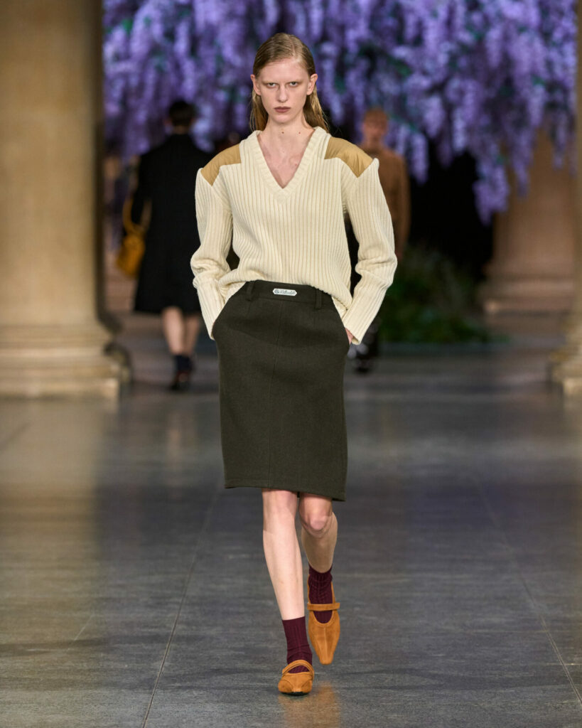 “For me the ambition is to make twee sexy,” he said. And this season, he did. The opening salvos were sharp: pinstripe suiting met army-surplus knits fitted with strong, squared shoulders. “You start with this military, naval world. And then the characters you would meet travelling along the river – sports players, fishermen.”
