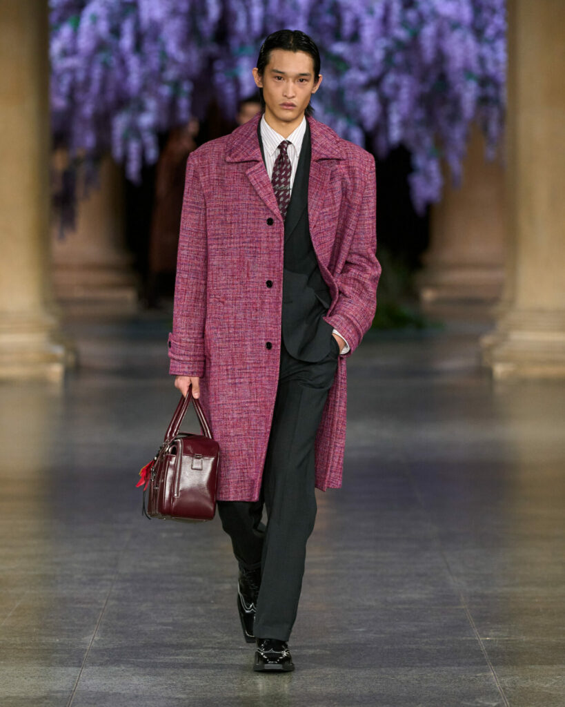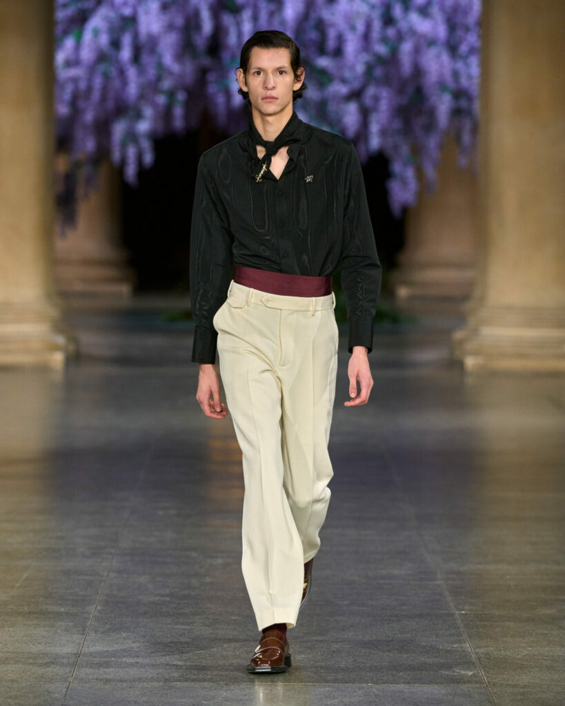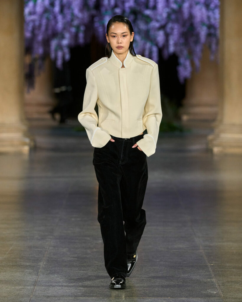 With his third runway show for the Guangzhou-based brand, Fletcher traced a line from southern China to the banks of the Thames, inspired by the journey of wisteria brought to the UK in the 1800s. “It was the first one ever brought to the UK and Europe, planted in Chiswick,” Fletcher explained backstage. “It became the origin plant for all the wisteria in Europe that still blooms today. Something coming over from Guangzhou and finding its roots here in the UK is what I want to achieve with Mithridate.”