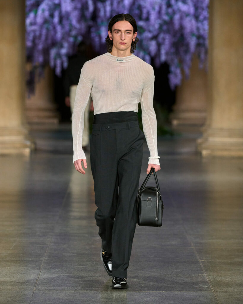 The menswear was defined by a sense of dressed-up debauchery – shirts left seductivley unbuttoned, Cumberland belts pulled tight and sitting just beneath the waistband, echoing the flash of logo underwear peeking above low-slung trousers.